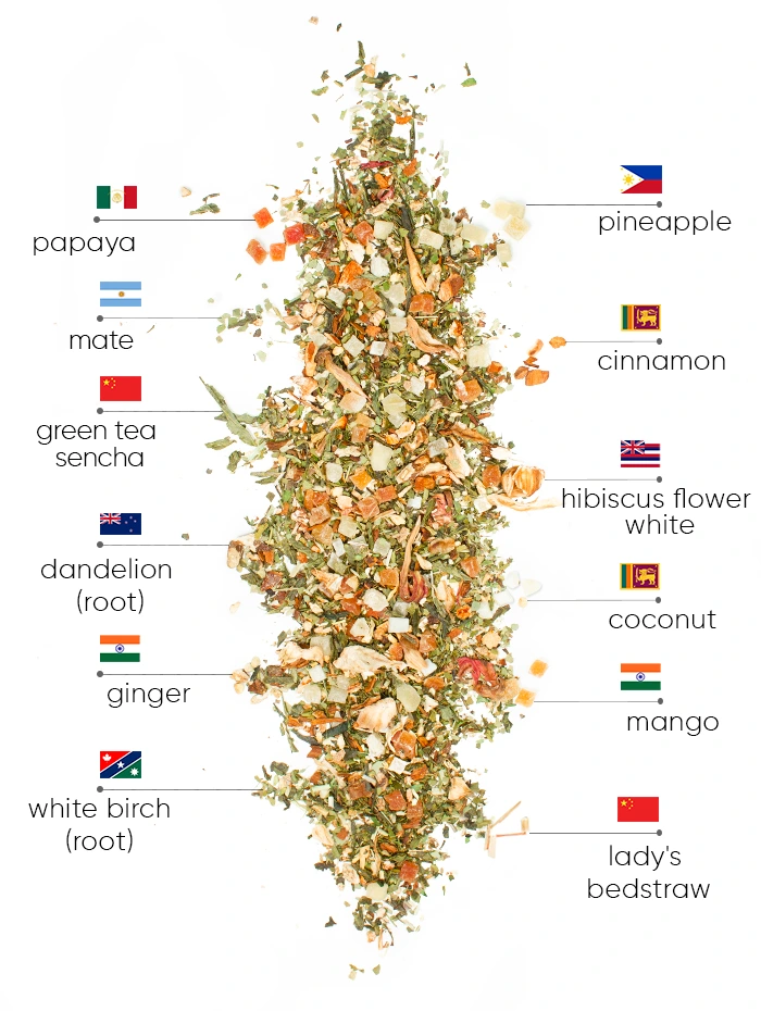 To achieve this, we enriched our best-selling SlimFit formula with several additional herbs, such as White Birch and Galium Verum, among others, whose effects start with the first sip and intensify over time! This is how our new SlimFit Summer Tropicana tea was created!